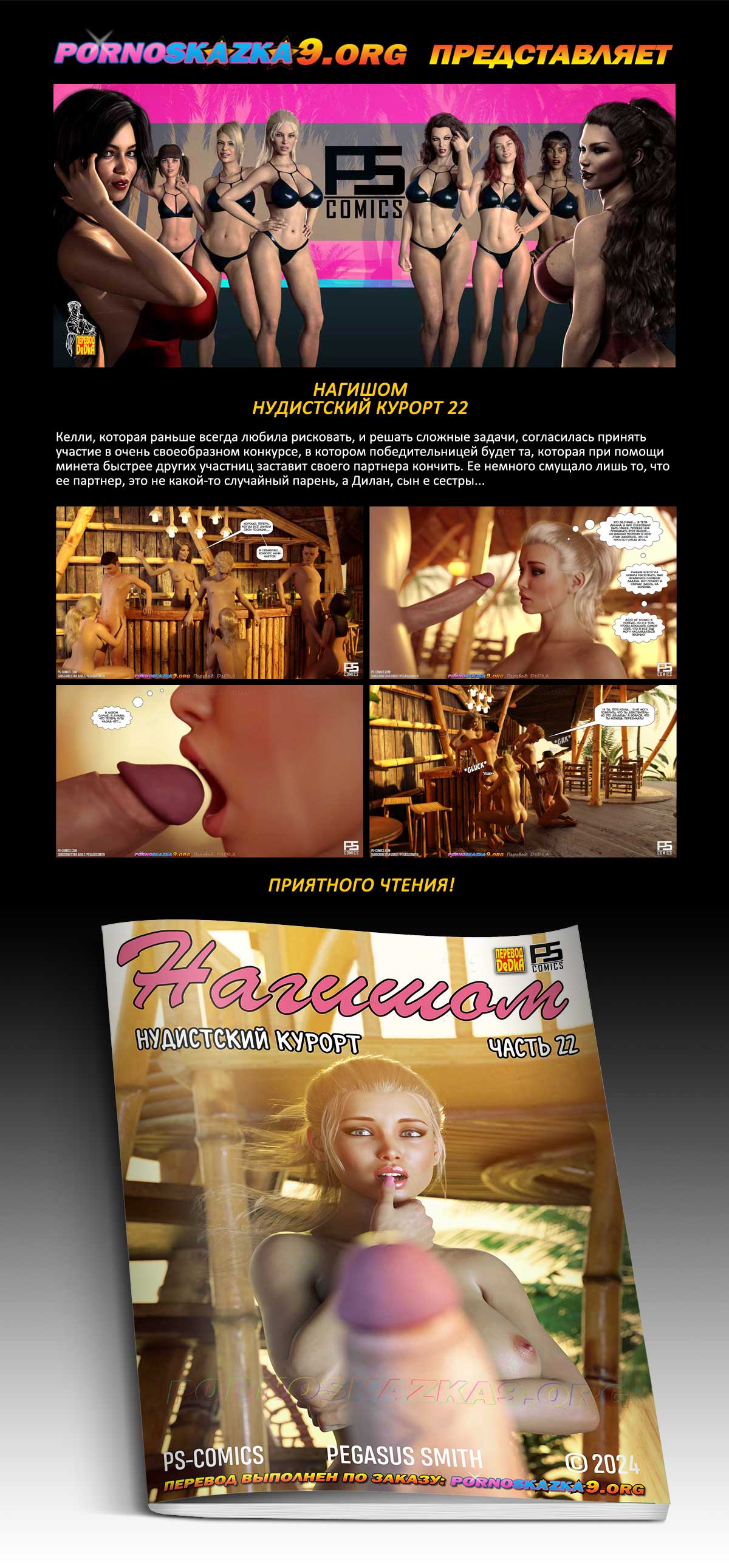 Порно комикс «Нагишом. Нудистский курорт. Часть 22.» Келли, которая раньше всегда любила рисковать, и решать сложные задачи, согласилась принять участие в очень своеобразном конкурсе, в котором победительницей будет та, которая при помощи минета быстрее других участниц заставит своего партнера кончить. Ее немного смущало лишь то, что ее партнер, это не какой-то случайный парень, а Дилан, сын е сестры…
